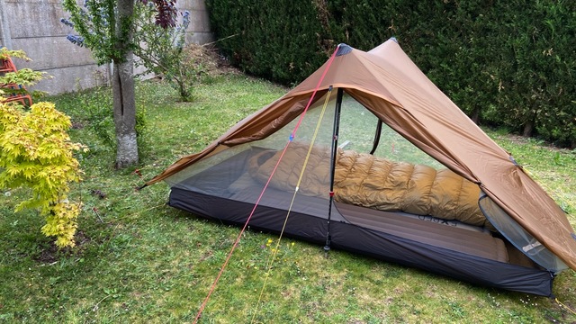 Delivery time to Germany: 22 days. As expected, the tent makes a very good impression during the first test setup. The color “khaki” is more of a darker shade of brown, but it fits very well and inconspicuously into nature and looks nice. Still, it’s not dark inside the tent. No assembly instructions are included, so you should watch a few related videos on Youtube: there are a few tricky details that you should understand in order to set up and use the tent optimally. The 4-season version including the stuff sack weighs 935 g, plus 98 g for the 8 pegs (16 cm, X-profile) with bag, which adds up to 1,033 g compared to the lightest version in the sales description with 915 g. I didn’t weigh the supplied syringe to re-seal the seams and the repair patch.