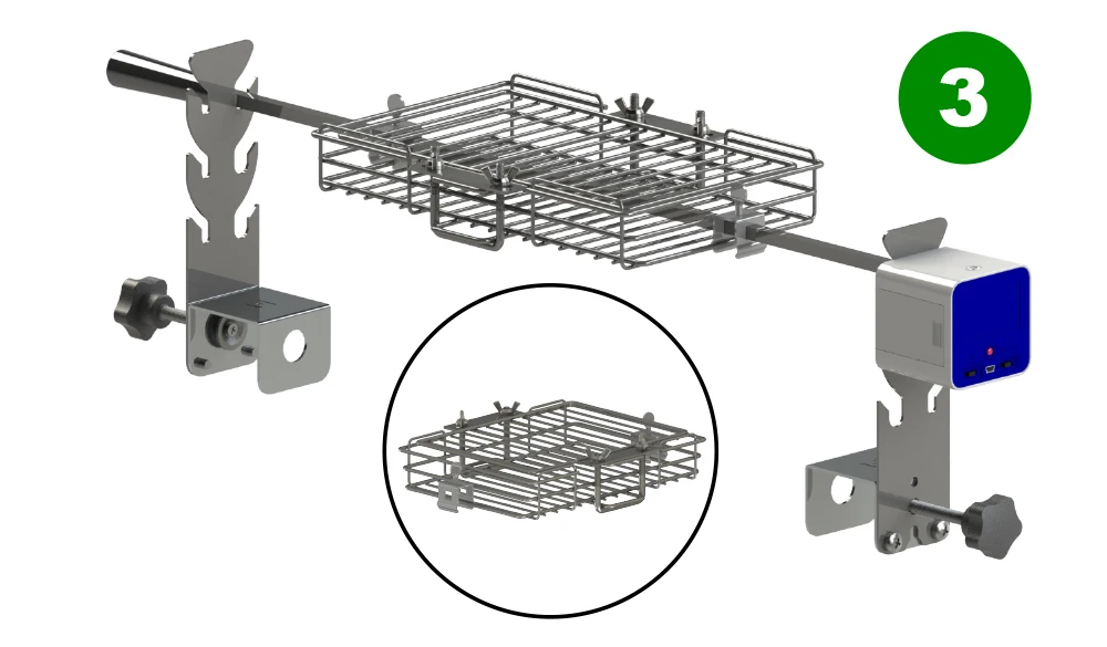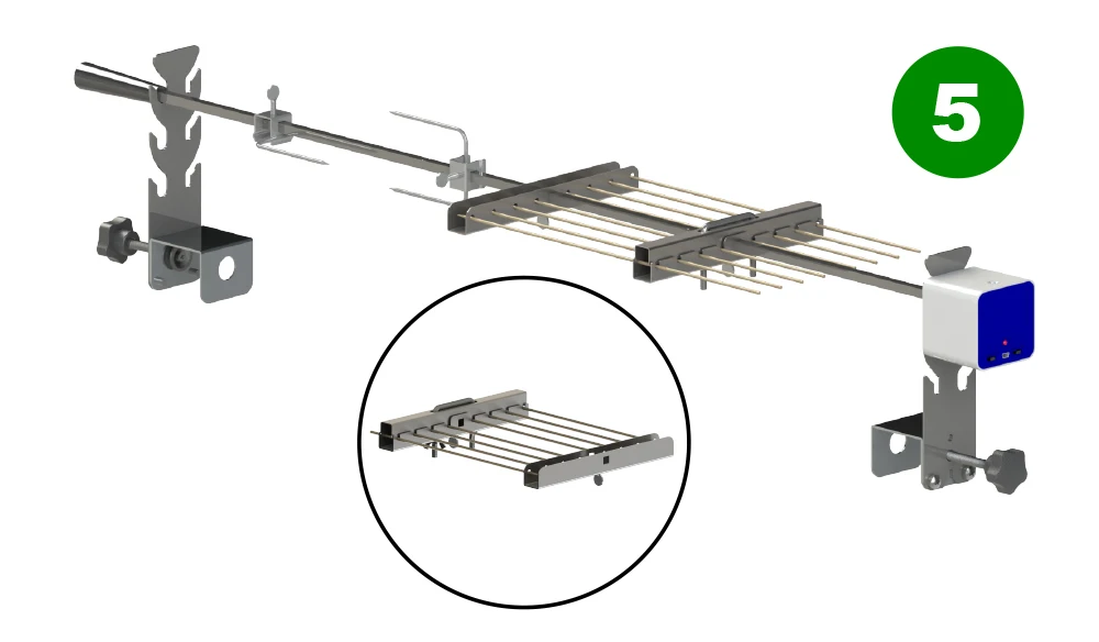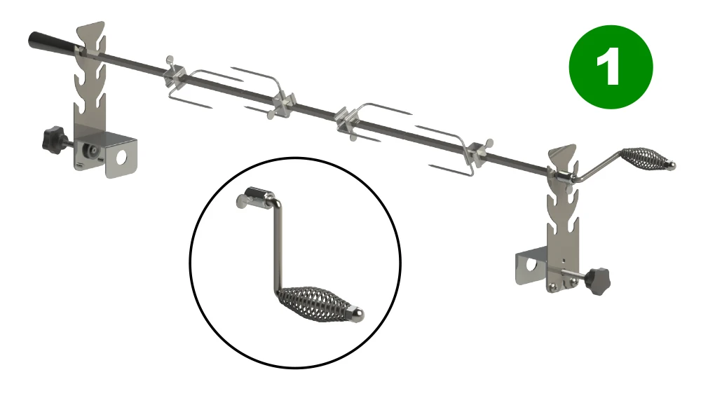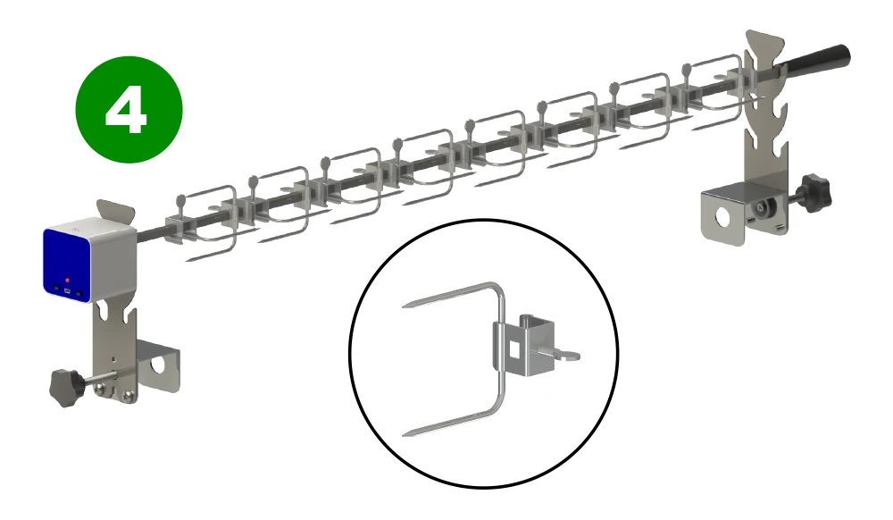 The forks through the rod, screw the thumb screws to the forks. After loading the food, adjust it to the proper position and tighten the thumb screws.
