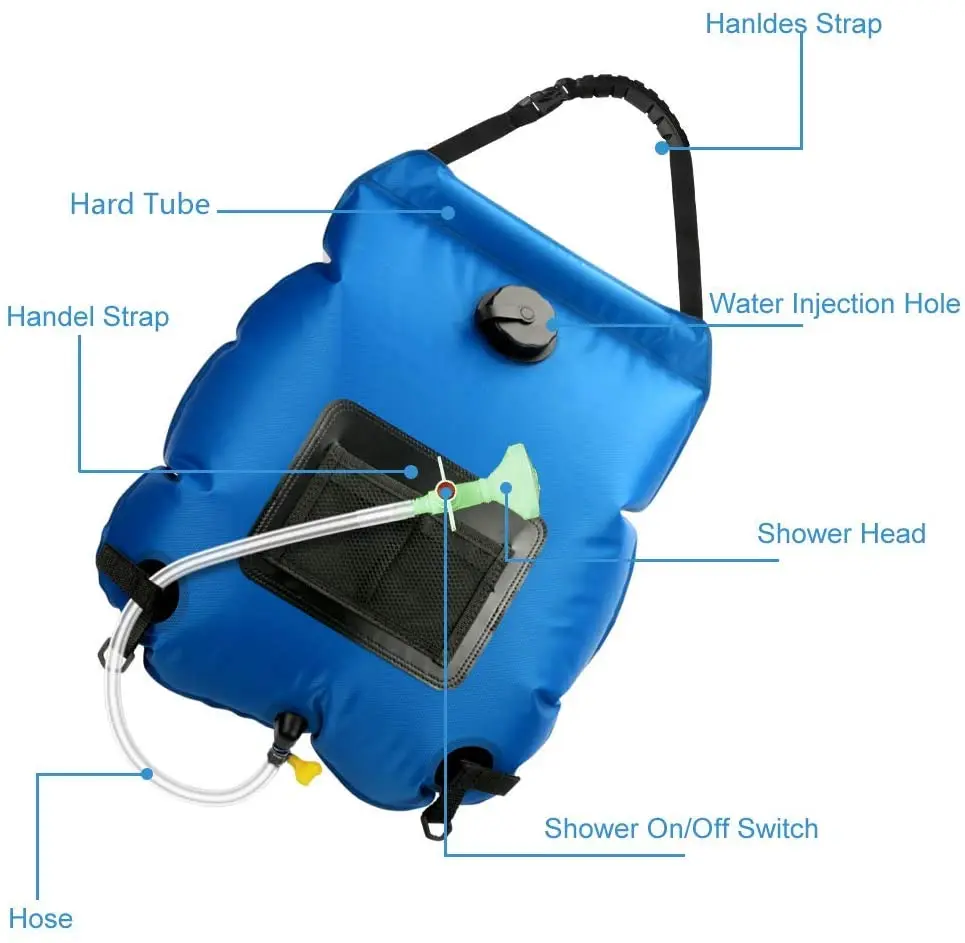 Included 1 x 5 gallons(20L) Shower Bag 1 x Hanging Strap 1 x Plastic Tube 1 x Shower Head