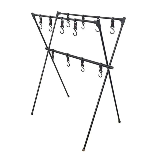 This cookware hanger rack is constructed from aluminum alloy to ensure durability and stability. It comes with hooks to hang pot, pan, clothes, and other outdoor gears. It is foldable and portable, great for outdoor camping, hiking, backpacking, BBQ, picnic, etc.